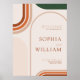 Affiche de bienvenue mariage boho moderne aux formes arches en terre cuite, rouille, orange brûlée, vert foncé, tons émeraude. Collection : https://www.zazzle.com/collections/boho_arch_abstract_wedding_collection-119061662657911589