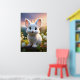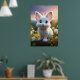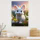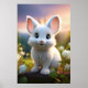 Poster d'un mignon lapin blanc aux grands yeux bleus et à la fourrure moelleuse au milieu des fleurs blanches et du feuillage vert, avec un coucher de soleil doux dans l'arrière - plan. Le décor évoque un sentiment de chaleur et de sérénité.