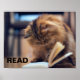 Affiche éducative amusante avec un félin littéraire. Créé pour encourager et soutenir le développement des compétences en alphabétisation chez les enfants.