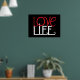 Simple design graphique en rouge, blanc et noir, avec des mots positifs d'encouragement, nous rappelant à tous d'aimer la vie ! Aussi une carte, autocollant, aimant, porte - clé, t-shirts, tablier.