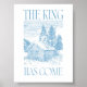 Affiche de fête chrétienne avec une illustration cabine vintage dans les bois enneigés et l'expression "Le roi est venu." Le design bleu apporte une touche apaisante à l'art traditionnel des murs de Noël.