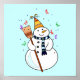 Joyeux bonhomme de neige célébrant avec des confettis flottant autour de lui.