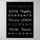 Poster typographique représentant les villes d'Italie et de Sicile : Florence, Rome, Naples, Sorrento, Vérone, Gênes, Palerme, Milan, Venise et Bologne