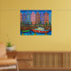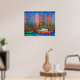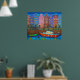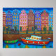 Scène nocturne animée et stylisée des maisons étroites et colorées d'Amsterdam, le long des canaux imprimés par l'artiste populaire Lisa Lorenz
