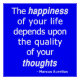 Des réflexions de qualité ? Alors une Vie Heureuse... La citation de l'empereur et philosophe romain Marcus Aurelius est : "Le bonheur de votre vie dépend de la qualité de vos pensées : par conséquent, gardez-vous en conséquence, et prenez soin de ne pas recevoir de notions inadaptées à la vertu et à la nature raisonnable." Texte blanc sur un arrière - plan bleu.
