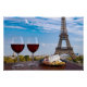 Deux verres de vin rouge avec snacks avec vue sur Paris et la tour Eiffel. Verre de vin rouge avec différents snacks - assiette au jambon, tranché, fromage bleu. Fête romantique en couple. Café avec vue