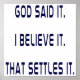 Des lettres simples et claires disent les choses comme elles sont : "Dieu l'a dit. Je le crois. Cela règle la question." Une excellente façon de partager votre foi en Dieu et votre croyance en votre religion. Un excellent cadeau pour les occasions religieuses telles que les baptêmes, les confirmations, les premières communions, les mariages, les ordinations et plus encore. Également bon à Noël, Pâques et les anniversaires aussi.