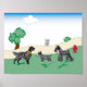 Dessin de trois chiens traînant dans un parc pour chiens. Les chiens sont basés sur des références photo.
