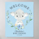 Belle affiche de baby shower de bienvenue avec l'éléphant bleu jungle le plus doux posé sur un arrière - plan bleu