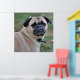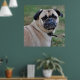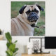 Une photo d'un adorable carlin regardant la caméra avec un bout d'herbe qui sort de sa bouche.