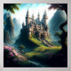 C'est l'affiche d'un beau château de conte de fées imaginatif et classique dans un pré verdoyant avec des fleurs roses. Il a été fabriqué avec Leonardo.ai.
