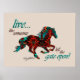 C'est une affiche unique "One of a Kind" qui met en oeuvre le cheval ! Il comporte une silhouette de cheval galopante en turquoise, orange et noir sur un Arrière - plan Tan et les mots ondulants..."Live Like That Left The Gate Open"! Il s'agit d'un graphisme original créé par l'artiste Kerry Miller.