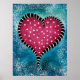 Un coeur rose cahot croustillant avec une garniture rayée noire serpentée sur un arrière - plan bleu et turquoise applaudi avec des reflets blancs.