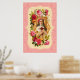 Saint Rose de Lima tient un crucifix et est entouré de beaux roses de rose et jaune avec défilement. L'arrière - plan est à motif rose couleur et jaune brocade qui complique l'image colorée.