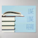 Photographie de cinq livres empilés avec le livre haut ouvert sur l'arrière - plan bleu. Le texte personnalisable dit : "Vis, Amour, Lis."