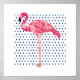 Poster avec illustration flamand rose et motif à points bleus.