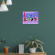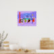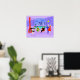 Cette affiche retro Tropical Cocktail Party Stretched est enivrant dans ses détails. Le dessin animé présente le type de cocktail extrêmement sophistiqué que l'on ne voit normalement que dans les films des années 1960. Un salon moderne du milieu du siècle est rempli de fêtards qui apprécient la décoration chic et violette. Une jolie femme en uniforme de domestique française porte un plateau de martinis. Elle se tient à côté d'une cheminée rouge à cônes avec un feu rugissant. Au centre de la pièce, un beau couple s'installe dans des chaises à oeufs d'orange. La femme porte une robe verte et brillante. L'homme porte un costume noir avec une cravate rouge. Ils tiennent chacun un martini. Un autre couple devient cosy sous un lustre suspendu, jaune, Spoutnik. Le distingué homme aux cheveux blancs porte un costume bleu, une chemise bleu clair et une cravate rouge. Il tient aussi un martini dans chaque main, montrant au monde que ses jours de fête sont loin d'être terminés. Son compagnon est une blonde en forme dans une robe rouge étonnante. Derrière cette scène, on peut voir à travers des murs en verre du sol au plafond. La scène extérieure dispose d'une piscine ronde et turquoise. On peut voir la silhouette violette d'une femme plongeant ses jambes dans l'eau. Entre les murs violets et en pierre, il y a des silhouettes de palmiers. Les silhouettes de danses et de fêtards parlants sont également visibles. S'il y a une chose que cela prouve, c'est que, tandis que les gens qui vivent dans des maisons en verre ne devraient pas jeter des pierres, ils devraient certainement jeter des fêtes !