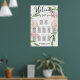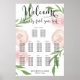 Carte des sièges mariages avec fleurs roses et texte noir personnalisable - vous pouvez ajouter le nom de la mariée et du marié, la date du mariage et les noms des invités (table royale pour 16 invités et 10 tables pour 10 invités chacun). Les dimensions de l'affiche sont de 24 pouces sur 36 pouces.