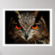 Photographie du visage d'une chouette d'aigle aux yeux orange étonnants.