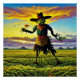 A.I.a créé l'impression d'un épouvantail vêtu d'un costume se dresse au milieu de champs de légumes luxuriants sous un soleil couchant vibrant. Le paysage s'étend au loin avec des rangées de cultures et un ciel coloré rempli de nuages