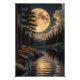 Une lune pleine géante et radieuse domine l'horizon, jetant sa lumière dorée sur les eaux calmes d'un lac encadré par des forêts et des montagnes. La scène évoque la magie, la sérénité et le pouvoir intemporel de la nature en parfaite harmonie.