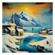 L'I.A. a créé l'interprétation d'une scène hivernale sereine se déroule avec un paysage de fjord enneigé qui comprend une église, des maisons et des montagnes sous un ciel de couleur chaude. Une rivière traverse la neige, menant l'oeil vers la mer où vogue en silence un bateau solitaire.