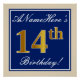 Cette affiche simple et élégante de fête d’anniversaire comporte un message personnalisé comme "AnameHere’s 14th Birthday!" (avec le "14th" qui a un look de couleur fausse/imitation or) dans une zone carré de couleur bleue avec un contour de bordure simple. Le nom est dans un élégant texte blanc de couleur script, et peut être customisé. Une affiche de fête d'anniversaire personnalisée comme celle-ci pourrait peut-être servir de décoration à une fête organisée pour quelqu'un qui célèbre son quatorzième anniversaire. [~Z0000239]