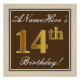 Cette affiche simple et élégante de fête d’anniversaire comporte un message personnalisé comme "AnameHere’s 14th Birthday!" (avec le "14th" qui a un look de couleur fausse/imitation or) dans une zone carré de couleur marron avec un contour de bordure simple. Le nom est dans un élégant texte de couleur blanche en forme de script, et peut être personnalisé. Une affiche de fête d'anniversaire personnalisée comme celle-ci pourrait peut-être servir de décoration à une fête organisée pour quelqu'un qui célèbre son quatorzième anniversaire. [~Z0000240]