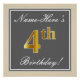 Cette conception simple et élégante d'affiche de fête d'anniversaire comporte un message personnalisé comme « Nom-Ici son 4ème anniversaire ! » (avec le « 4ème » ayant un aspect de couleur dorée fausse/imitée) dans une zone carrée de couleur grise comportant un simple contour de bordure. Le nom est dans un texte de type écriture élégant de couleur blanche, et peut être personnalisé. Une affiche de fête d'anniversaire personnalisée comme celle-ci pourrait peut-être être utilisée comme décoration lors d'une fête organisée pour quelqu'un qui célèbre son quatrième anniversaire.