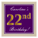 Cette affiche simple et élégante de fête d’anniversaire comporte un message personnalisé comme "22e anniversaire de Caroline!" (avec le "22e" à l’allure fausse/imitation dorée) dans une zone carré de couleur violette avec un contour de bordure simple. Le nom est dans un élégant texte blanc de couleur script, et peut être customisé. Une affiche de fête d'anniversaire personnalisée comme celle-ci pourrait peut-être servir de décoration à une fête organisée pour quelqu'un qui célèbre son vingt-deuxième anniversaire. [~Z0000238]