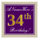 Cette affiche simple et élégante de fête d’anniversaire comporte un message personnalisé comme "AnameHere’s 34th Birthday!" (avec le "34th" qui a un look de couleur fausse/imitation or) dans une zone carré de couleur violette avec un contour de bordure simple. Le nom est dans un élégant texte de couleur blanche en forme de script, et peut être personnalisé. Une affiche de fête d'anniversaire personnalisée comme celle-ci pourrait peut-être servir de décoration à une fête organisée pour quelqu'un qui célèbre son trente-quatrième anniversaire. [~Z0000238]