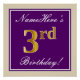 Cette affiche simple et élégante de fête d’anniversaire comporte un message personnalisé comme "NameHere’s 3rd Birthday!" (avec le "3rd" qui a un look de couleur fausse/imitation or) dans une zone carré de couleur violette avec un contour de bordure simple. Le nom est dans un élégant texte de couleur blanche en forme de script, et peut être personnalisé. Une affiche de fête d'anniversaire personnalisée comme celle-ci pourrait peut-être servir de décoration à une fête organisée pour quelqu'un qui célèbre son troisième anniversaire. [~Z0000238]