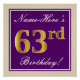 Cette affiche simple et élégante de fête d’anniversaire comporte un message personnalisé comme "Nom-Voici 63e anniversaire!" (avec le "63e" ayant un look de couleur fausse/imitation or) dans une zone carré de couleur violette avec un contour de bordure simple. Le nom est dans un élégant texte de couleur blanche en forme de script, et peut être personnalisé. Une affiche de fête d'anniversaire personnalisée comme celle-ci pourrait peut-être servir de décoration à une fête organisée pour quelqu'un qui célèbre son soixante-troisième anniversaire. [~Z0000238]