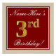 Cette affiche simple et élégante de fête d’anniversaire comporte un message personnalisé comme "Nom-Voici le 3e anniversaire!" (avec le "3e" ayant un look de couleur fausse/imitation or) dans une zone carré de couleur rouge avec un contour de bordure simple. Le nom est dans un élégant texte de couleur blanche en forme de script, et peut être personnalisé. Une affiche de fête d'anniversaire personnalisée comme celle-ci pourrait peut-être servir de décoration à une fête organisée pour quelqu'un qui célèbre son troisième anniversaire. [~Z0000234]