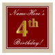 Cette affiche simple et élégante de fête d’anniversaire comporte un message personnalisé comme "Nom-Voici le 4e anniversaire!" (avec le "4e" ayant un look de couleur fausse/imitation or) dans une zone carré de couleur rouge avec un contour de bordure simple. Le nom est dans un élégant texte de couleur blanche en forme de script, et peut être personnalisé. Une affiche de fête d'anniversaire personnalisée comme celle-ci pourrait peut-être servir de décoration à une fête organisée pour quelqu'un qui célèbre son quatrième anniversaire. [~Z0000234]