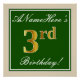 Cette affiche simple et élégante de fête d’anniversaire comporte un message personnalisé comme "AnameHere’s 3rd Birthday!" (avec le "3rd" qui a un look de couleur fausse/imitation or) dans une zone de carré de couleur verte avec un contour de bordure simple. Le nom est dans un élégant texte de couleur blanche en forme de script, et peut être personnalisé. Une affiche de fête d'anniversaire personnalisée comme celle-ci pourrait peut-être servir de décoration à une fête organisée pour quelqu'un qui célèbre son troisième anniversaire. [~Z0000235]