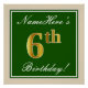 Cette affiche simple et élégante de fête d’anniversaire comporte un message personnalisé comme "NomVoici le 6e anniversaire!" (avec le "6e" ayant un look de couleur fausse/imitation or) dans une zone de couleur verte carré avec un contour de bordure simple. Le nom est dans un élégant texte de couleur blanche en forme de script, et peut être personnalisé. Une affiche de fête d'anniversaire personnalisée comme celle-ci pourrait peut-être servir de décoration à une fête organisée pour quelqu'un qui célèbre son sixième anniversaire. [~Z0000235]