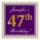 Cette conception simple et élégante d'affiche de fête d'anniversaire comporte un message personnalisé comme « Joyeux 47e anniversaire, Jennifer ! » (avec le « 47e » ayant un aspect de couleur dorée fausse/imitée) dans une zone carrée de couleur violette avec un simple contour de bordure. Le nom est dans un texte de type écriture élégant de couleur blanche et peut être personnalisé. Une affiche de fête d'anniversaire personnalisée comme celle-ci pourrait peut-être être utilisée comme décoration lors d'une fête organisée pour quelqu'un qui fête son quarante-septième anniversaire.