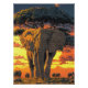 Un éléphant majestueux se dresse en profil, sa forme massive dessinée contre la lumière chaude d'un coucher de soleil doré. Son tronc se bouge avec grâce, descendant vers le bas pour recueillir les feuilles d'un grand arbre, tandis que des détails complexes mettent en évidence la texture de sa peau. Au loin, d'autres éléphants se déplacent calmement à travers les prairies, leur présence ajoutant un sentiment d'harmonie à la scène. La lumière douce et dorée du soleil couchant projette de longues ombres à travers les plaines, mettant l’accent sur la force paisible et digne de l’éléphant.