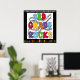 Arrière - plan noir coloré et amusant avec un bord de design coloré, des notes musicales et du texte multicolore qui dit "Roches de 3e année" sur des affiches de classe de 3e année que l'enseignant aimera!