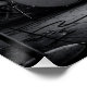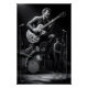 Un guitariste explose en mouvement, jouant de la guitare électrique, avec un groupe complet en arrière-plan. Un éclairage dramatique et une tonalité monochrome capturent l'intensité d'un spectacle vivant.