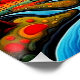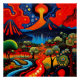 Une représentation vive et colorée d'une éruption volcanique domine la scène avec un ciel étoilé tourbillonnant et des coulées de lave stylisées. Au premier plan, une rivière sinueuse serpente à travers un paysage parsemé d'arbres arrondis et de collines ondoyantes, tandis qu'un ciel dynamique tourbillonne au-dessus de motifs audacieux