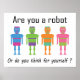 "Es-tu un robot ou penses-tu par toi-même ? C'est le dicton dans le design. Le graphique est quatre robots en couleurs pop art.