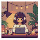 Dans cette scène cosy 8 bits, un personnage est assis sur un bureau avec un casque, immergé dans leurs études. Entouré de plantes intérieurs, de livres et d'un éclairage tamisé, l'ambiance est parfaite pour une solitude ciblée. L'esthétique du lo-fi ajoute une touche nostalgique et apaisante, ce qui en fait un cadre idéal pour la concentration et la relaxation.
