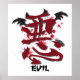 Poster du Mal Kanji. C'est le symbole kanji japonais pour le mal, et est écrit comme "aku" en anglais. Dans les histoires japonaises, et d'autres ouvrages, ce symbole est utilisé pour décrire quelque chose d'extrêmement sombre et sinistre. Le kanji pour le mal a un regard très distinct dessus, mais j'ai ajouté une queue, des ailes foncées et des cornes pointues pour qu'il soit plus reconnaissable à première vue.