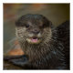 Un petit Otter griffé asiatique en gros plan quand il sortit de l'eau. L'eau chute encore sur ses chuchotements. Quand un compagnon a déménagé, il a regardé autour de tout surpris avec sa bouche ouverte montrant ses dents.