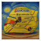 This painting depicts a vibrant yellow racing helmet covered with logos, set against a dramatically swirling blue night sky in a textured, expressive style reminiscent of Van Gogh.