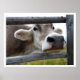 Photo d'une vache tyrolienne qui se balançait la tête à travers une barrière en bois.