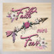 Éclaircissez votre maison avec cette affiche "Un de genre" Faith Over Fear! Il comprend les mots inspirants "Faith Over Fear" en rose et une belle flèche nichée parmi de jolies fleurs roses et crème avec des plumes violettes...sur un Arrière - plan de bois Design graphique original par l'artiste Kerry Miller.