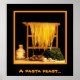 Cette affiche présente les créations d'un spectaculaire dîner de pâtes ! La fettucine a été roulée, coupée et suspendue jusqu'à sécher. Les clams sont prêts pour le shucking. Les gousses d'ail sont prêtes à être pressées. Le persil est prêt pour le hachage. Ils seront tous cuits dans de l'huile d'olive et du vin blanc pour un délicieux repas gastronomique. Le texte dit : Un festin de pâtes... Il peut être customisé ou supprimé pour répondre à vos besoins.